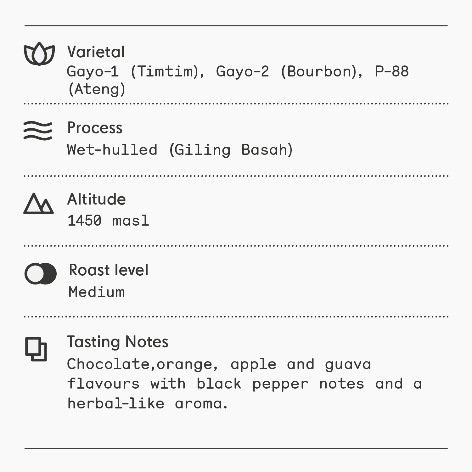 Sumatran coffees have a unique processing method, wet hulling known as Giling Basah process used by most farmers. This process gives the coffee its distinct characteristics of earthy tones, low acidity, full body and a fruity tang.