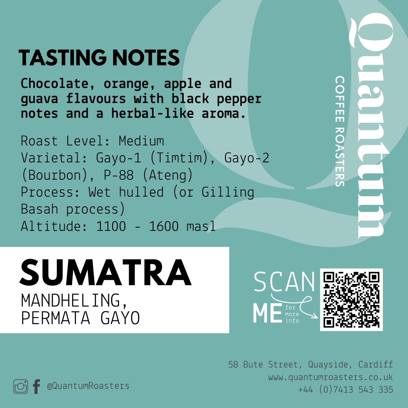 Sumatran coffees have a unique processing method, wet hulling known as Giling Basah process used by most farmers. This process gives the coffee its distinct characteristics of earthy tones, low acidity, full body and a fruity tang.