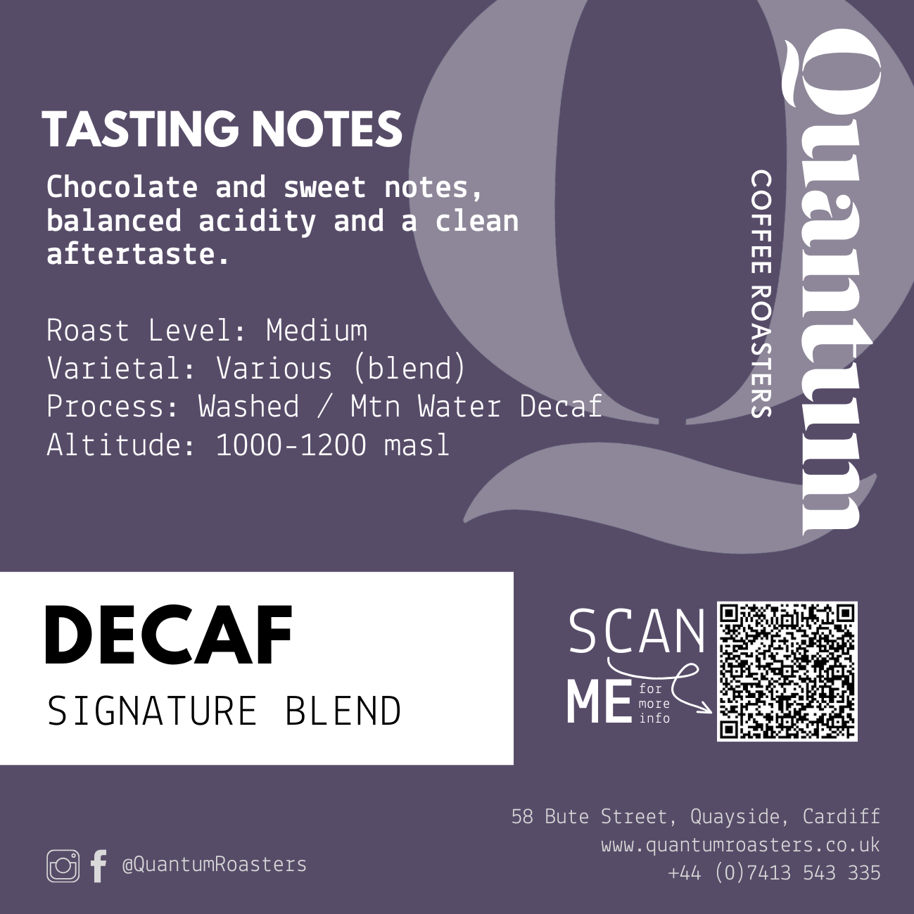 All the flavour of Quantum coffee without the caffeine, our signature decaf is tasty, full of chocolatey and sweet notes, a balanced acidity and a clean aftertaste.
