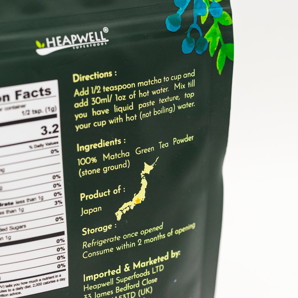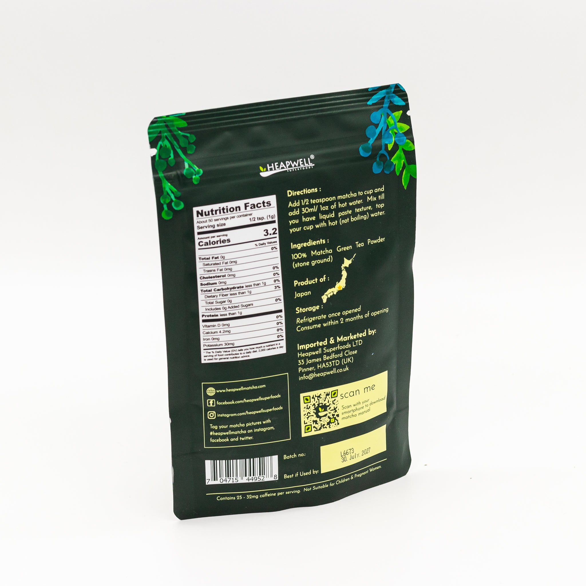 50g e bagINGREDIENTS: 100% Matcha Green Tea Powder (stone ground)Product of: Japan